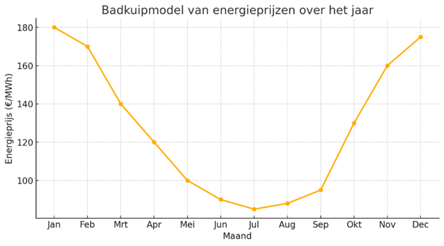 Dit patroon noemen we het badkuipmodel – hoog verbruik in de winter, laag in de zomer, en daarna weer omhoog in de volgende winter. Dit is heel normaal en wordt automatisch meegenomen in je maandelijkse afrekeningen en voorschotberekening.